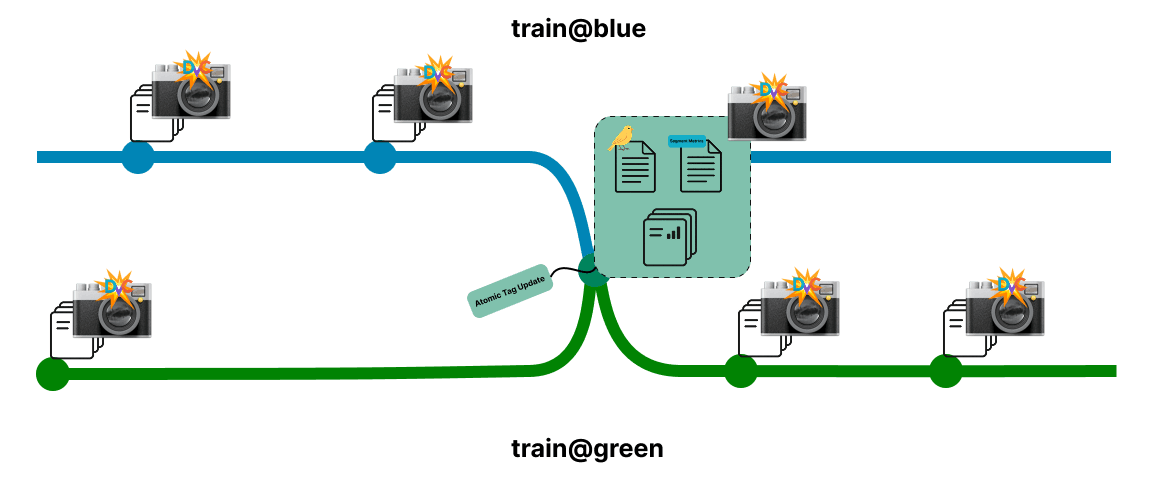 Blue/green datasets: Keep train@green serving production; build train@blue in parallel. Only flip the pointer after eval passes. Revert by swapping back.